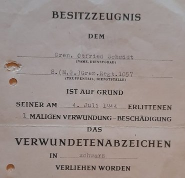 Am vergangenen Freitag hatte für Ottfried Schmidt ein langes Warten endlich sein gutes Ende gefunden. Er erhielt nach 80 Jahren das Verwundetenabzeichen, das ihm eigentlich schon am 27. Juli 1944 hätte verliehen werden sollen. Aber da gab es keines mehr. Wie nun Schmidt letzten Endes doch noch an das Abzeichen gelangte, ist eine interessante Geschichte und auch eng mit dem Volksbund verbunden. Dazu konnte er auch viel über seine Erlebnisse im Zweiten Weltkrieg erzählen.